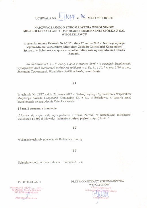 Uchwała Nr III/16/19 z dnia 30 maja 2019 r. w sprawie zmiany Uchwały Nr I/2/17 z dnia 22 marca 2017 r. Nadzwyczajnego Zgromadzenia Wspólników Miejskiego Zakładu Gospodarki Komunalnej Sp. z o.o. w Bolesławcu w sprawie zasad kształtowania wynagrodzenia Członka Zarządu