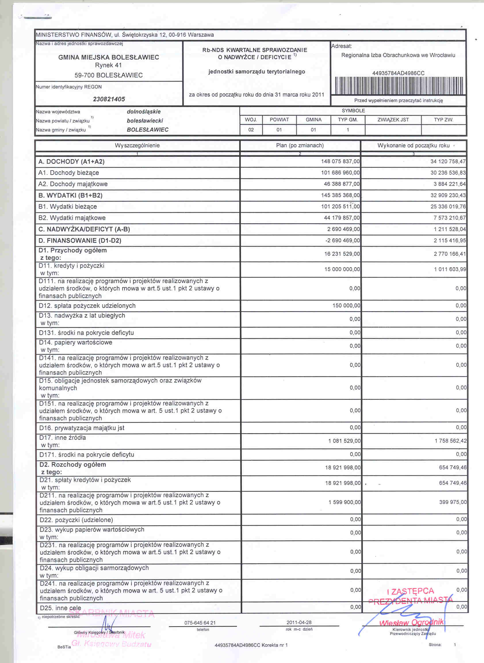 Rb-NDS kwartalne sprawozdanie o nadwyzce/deficycie jst za okres od początku roku do 31 marca 2011 r.