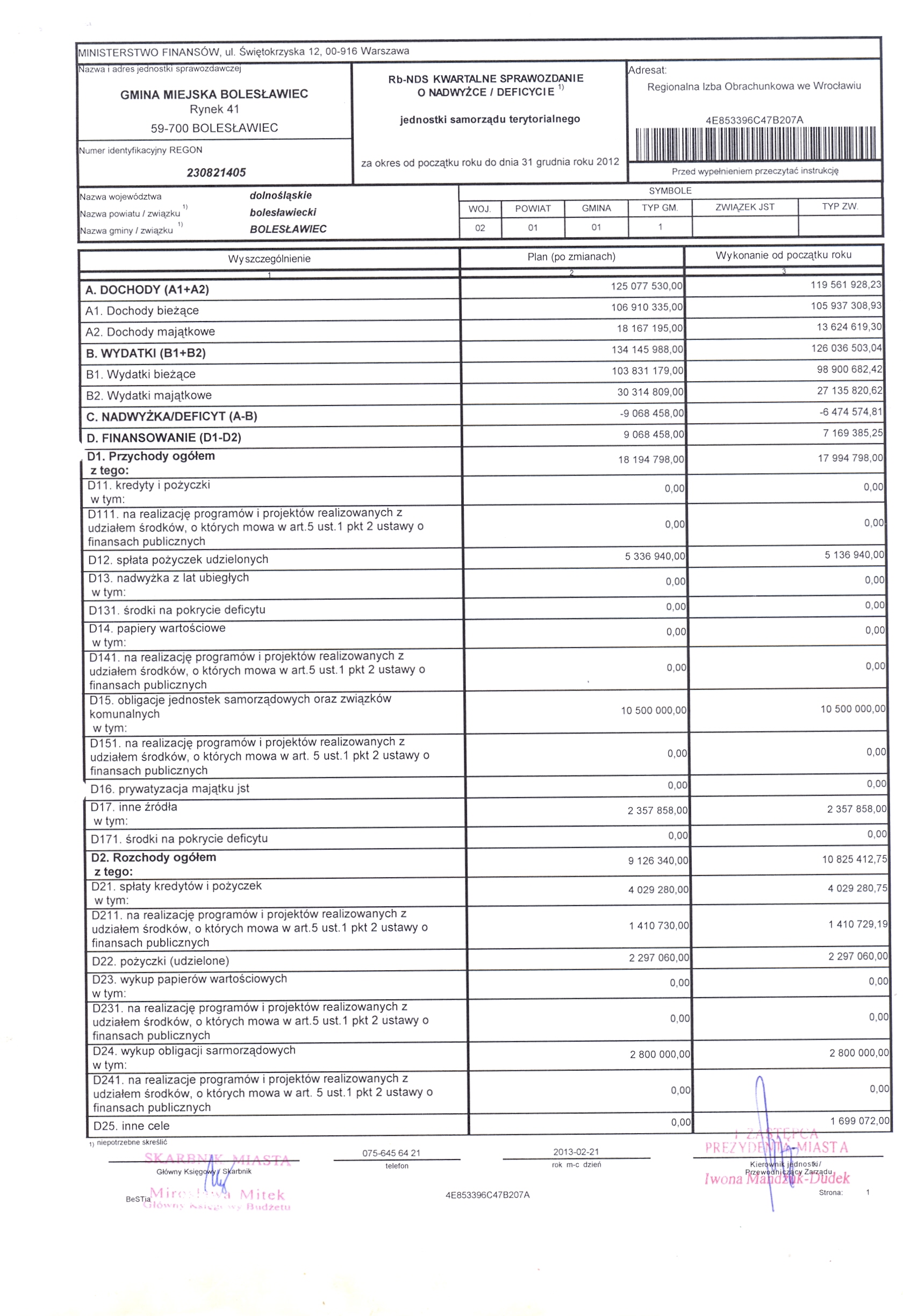 Rb-NDS kwartalne sprawozdanie o nadwyżce/deficycie jednostki samorządu terytorialnego za okres od początku roku do dnia 31 grudnia roku 2012