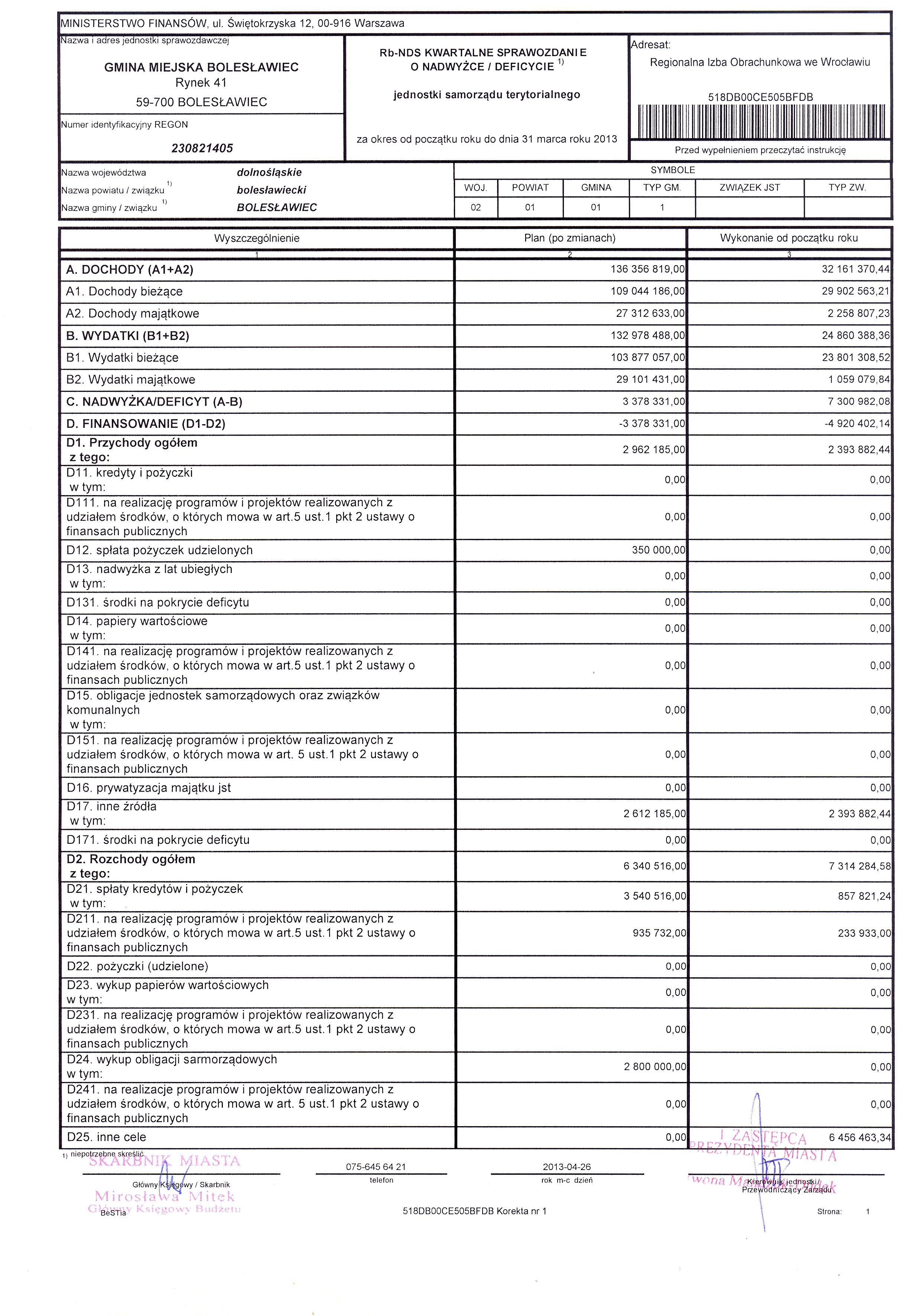 Rb-NDS Kwartalne sprawozdanie o nadwyżce/ deficycie jednostki samorządu terytorialnego za I kwartał 2013r.