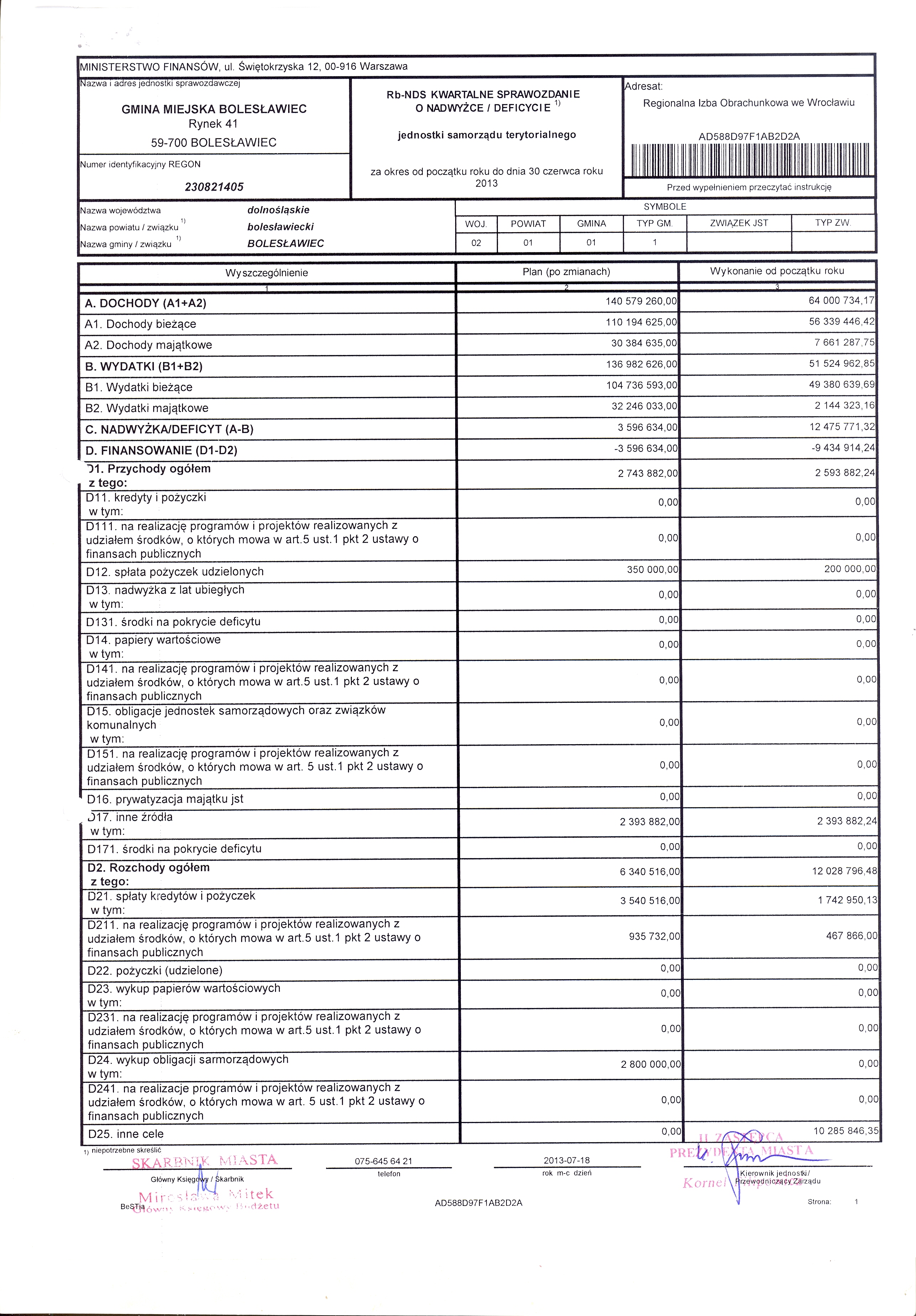 Rb-NDS Kwartalne sprawozdanie o nadwyżce/deficycie jednostki samorządu terytorialnego za okres od początku roku do dnia 30 czerwca 2013r.