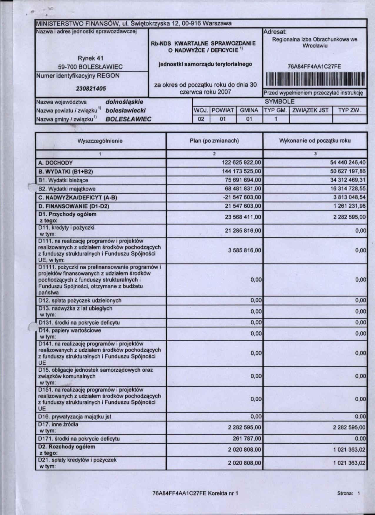 Rb-NDS Kwartalne Sprawozdanie o nadwyżce / deficycie - II kwartał 2007r. - cz.1