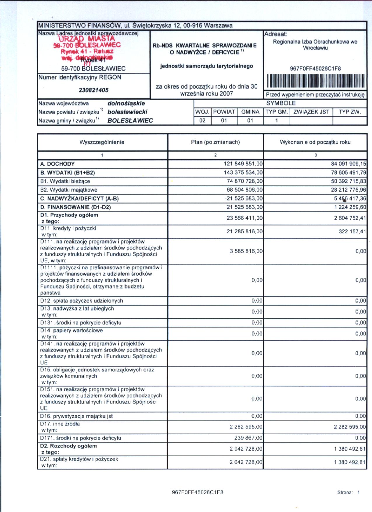 Rb-NDS Kwartalne Sprawozdanie o nadwyżce / deficycie - III kwartał 2007 r. - cz. 1