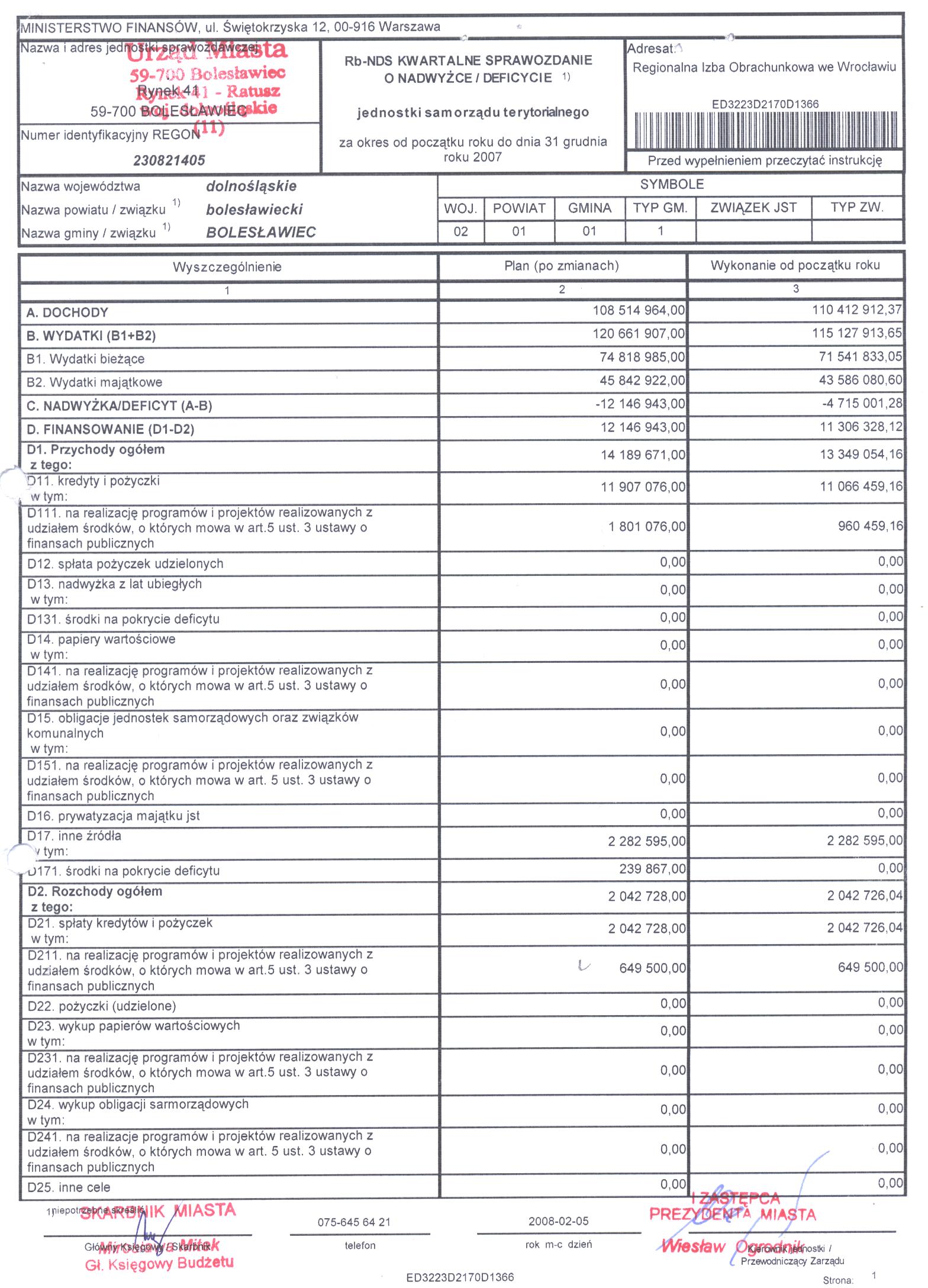 Rb-NDS Kwartalne Sprawozdanie o nadwyżce / deficycie - IV kwartał 2007r. cz. 2