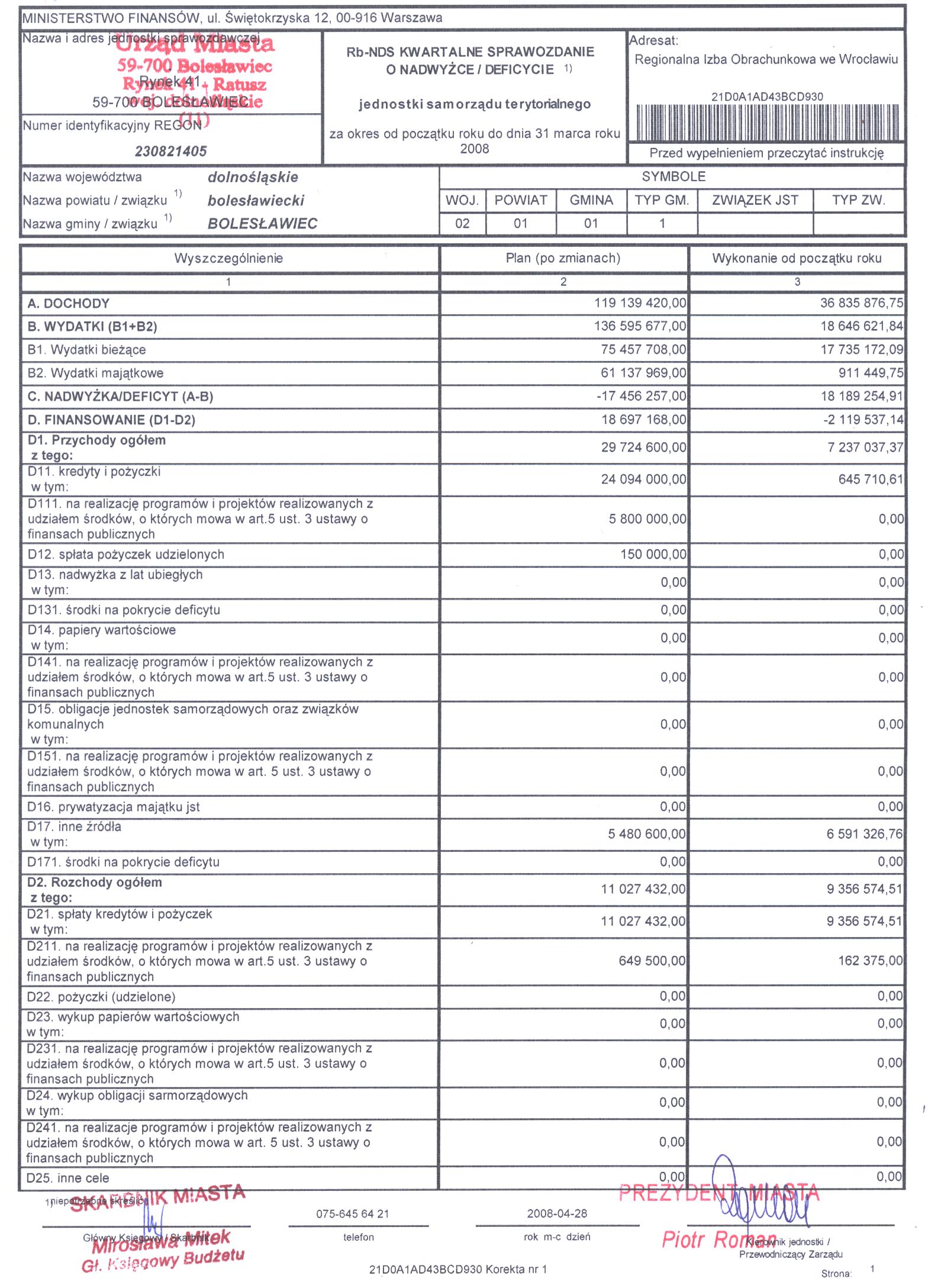 Rb-NDS Kwartalne Sprawozdanie o nadwyżce / deficycie I kwartał 2008r. cz. 1