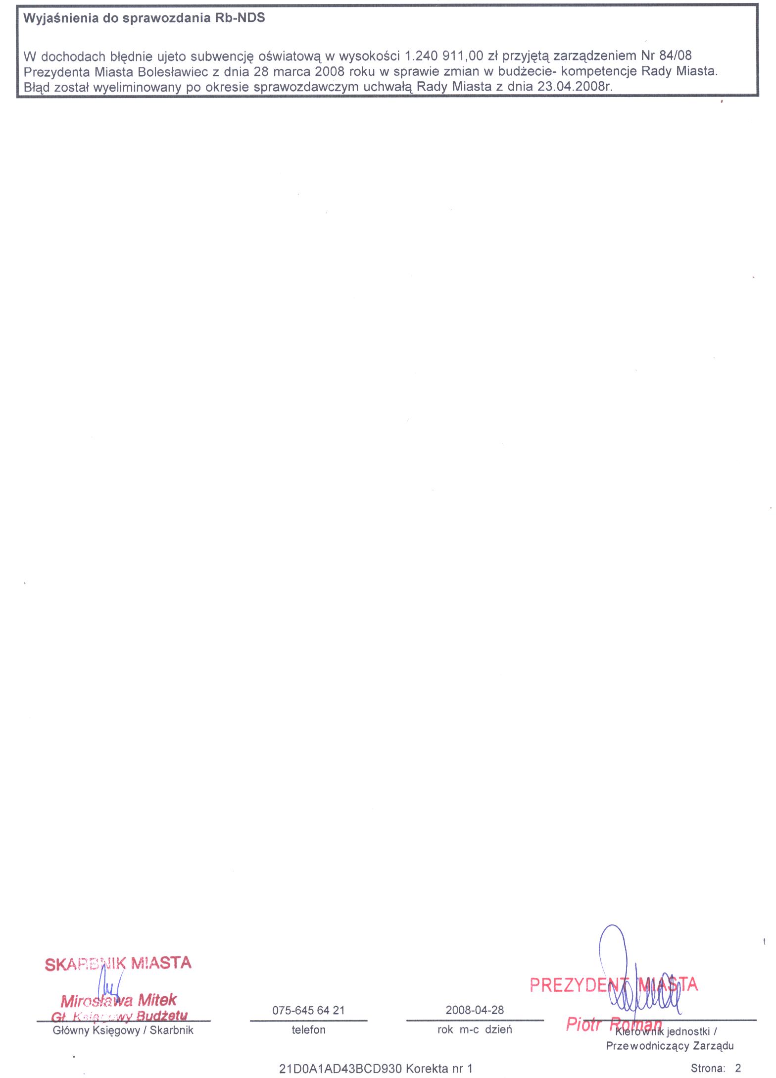 Rb-NDS Kwartalne Sprawozdanie o nadwyżce / deficycie - I kwartał 2008r. cz.2