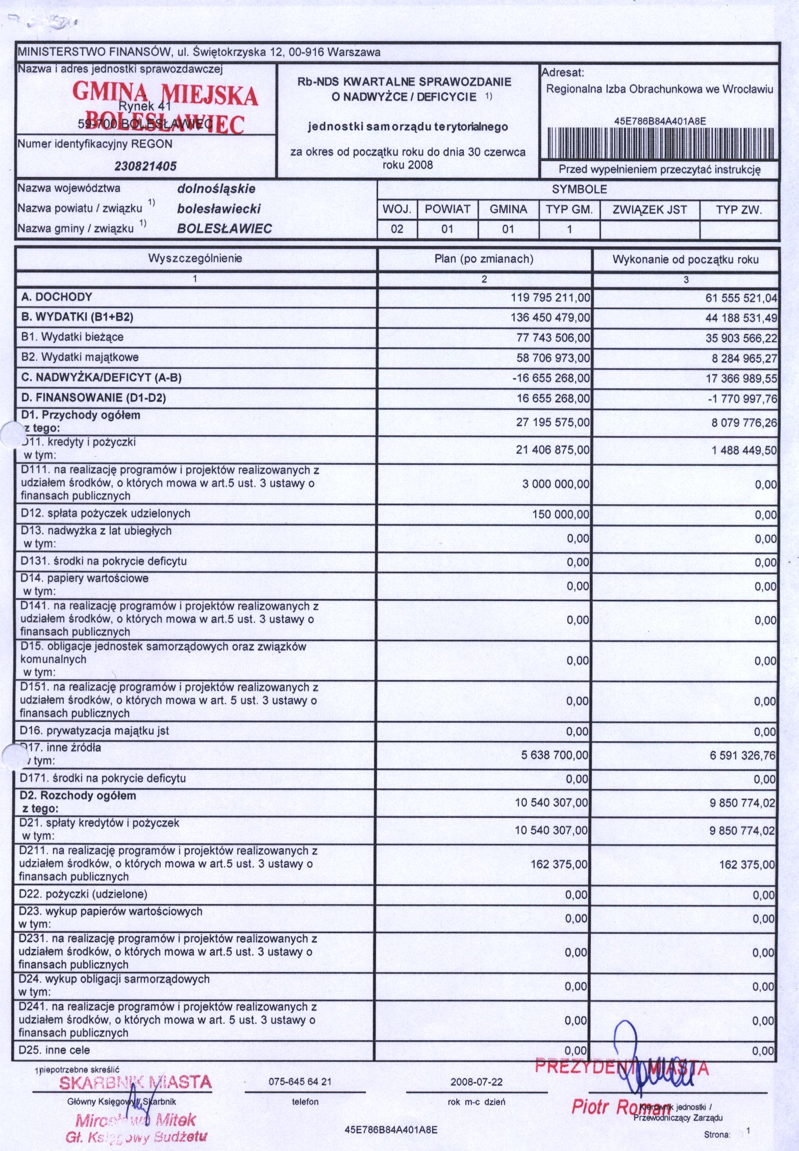 Rb-NDS Kwartalne Sprawozdanie o nadwyzce / deficycie - II kwartał 2008r. cz.1