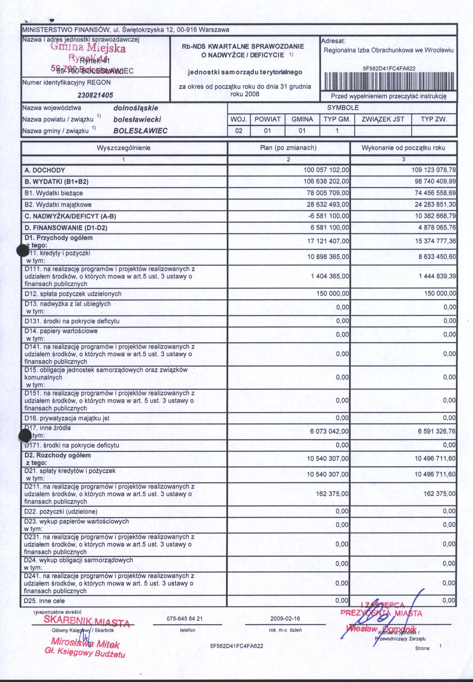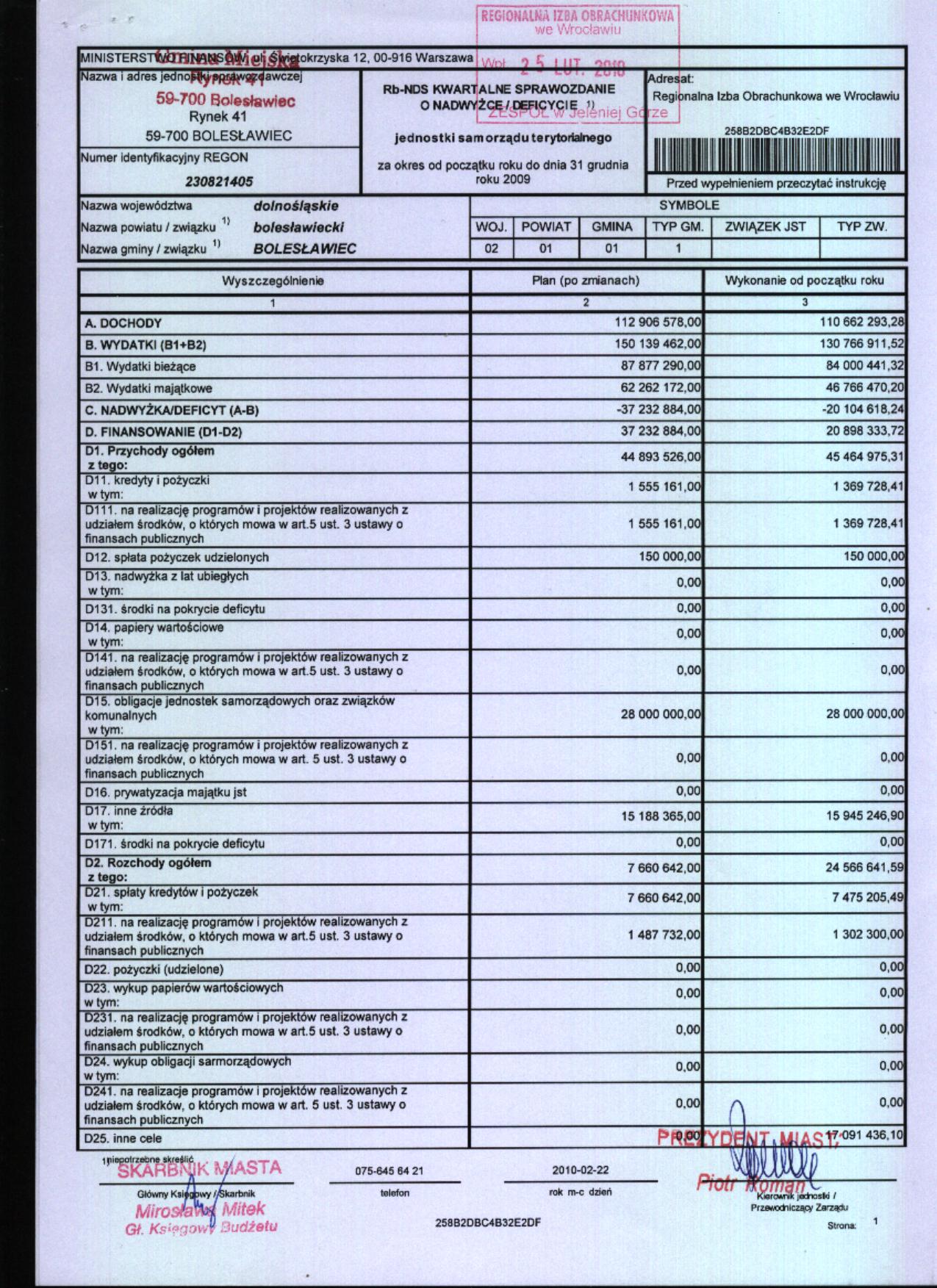 Rb-NDS kwartalne sprawozdanie o nadwyżce/deficycie jst za okres od początku roku do dnia 31 grudnia roku 2009