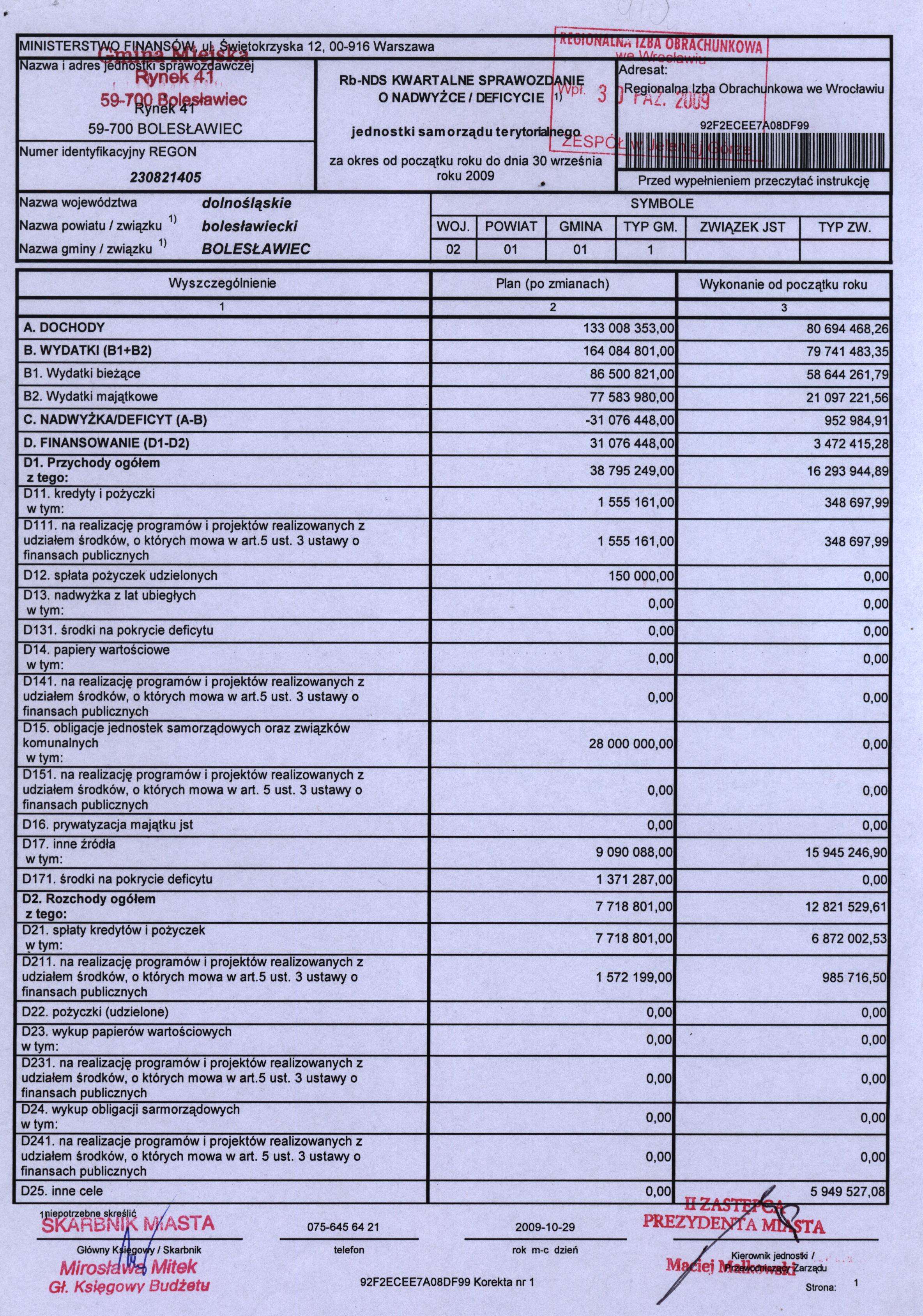 Rb-NDS kwartalnesprawozdanie o nadwyżce/deficycie jstza III kw. 2009 cz.1