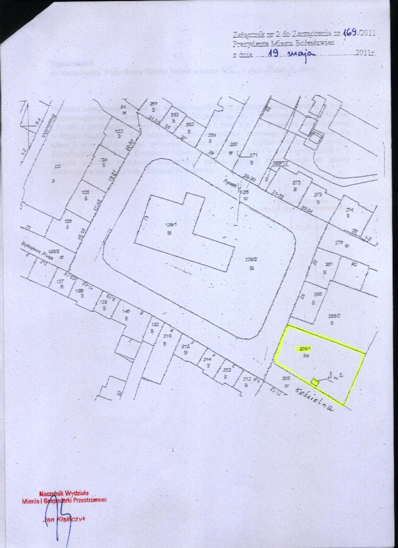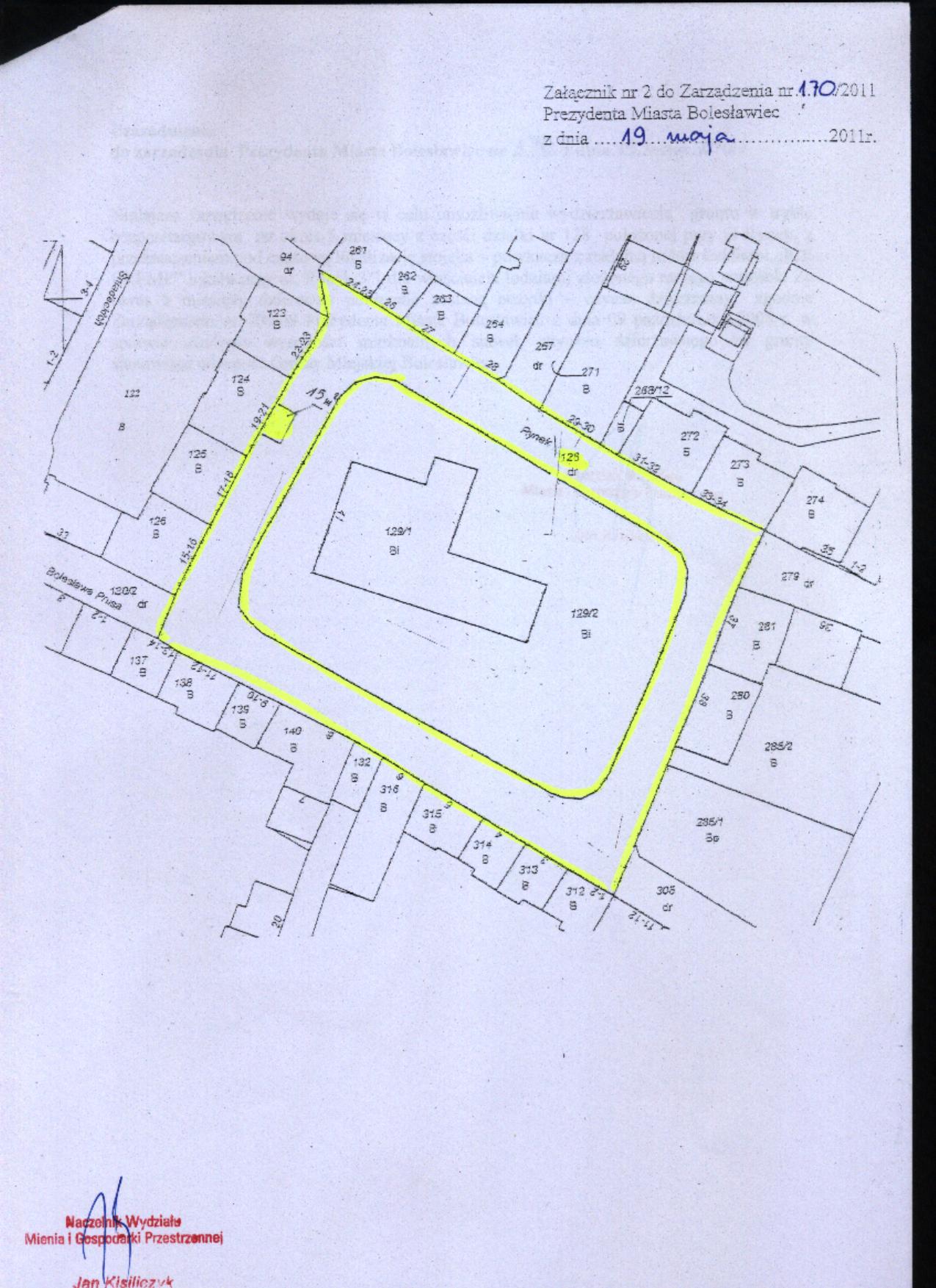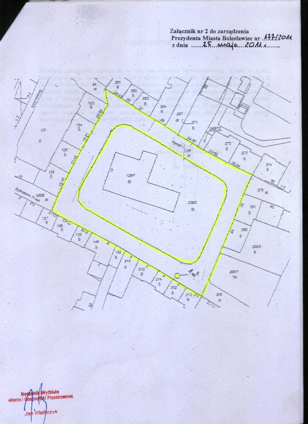 197/11  10.06.2011  zmiany zarządzenia Nr 287/09 Prezydenta Miasta Bolesławiec z dnia 21 września 2009 r. w sprawie przeznaczenia do oddania w użytkowanie wieczyste, w drodze bezprzetargowej, nieruchomości gruntowej zabudowanej położonej przy ul. Chopina w Bolesławcu, na rzecz współużytkowników wieczystych nieruchomości przyległej wraz ze sprzedażą części budynku - celem uregulowania stanu prawnego nieruchomości