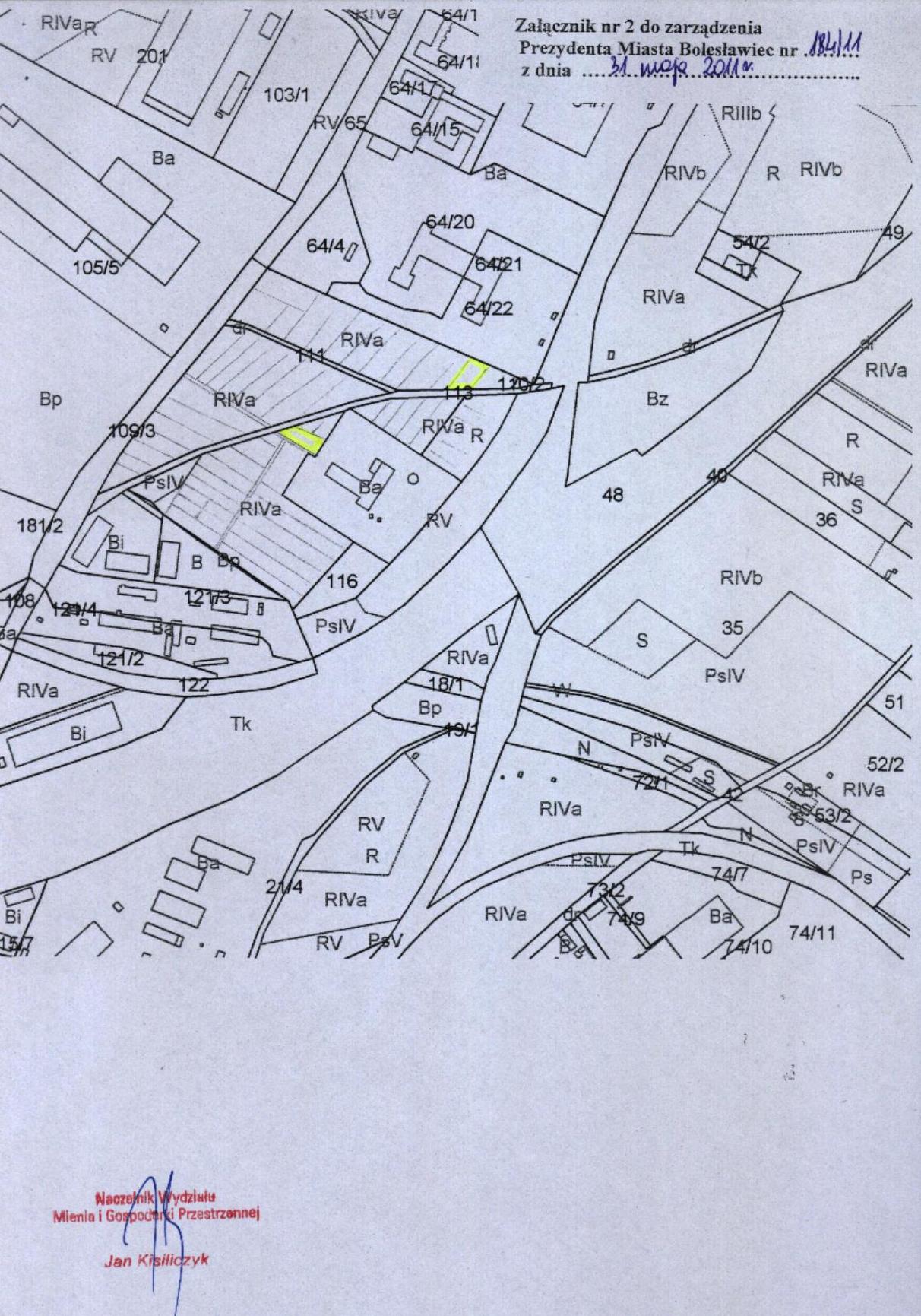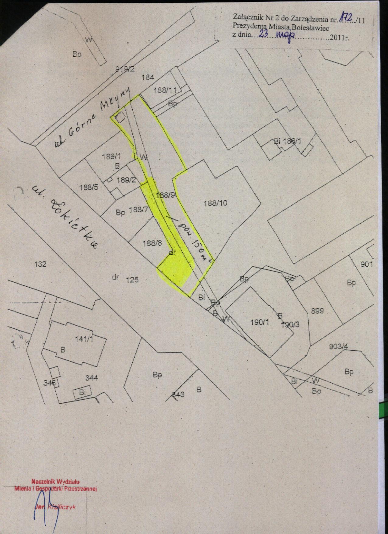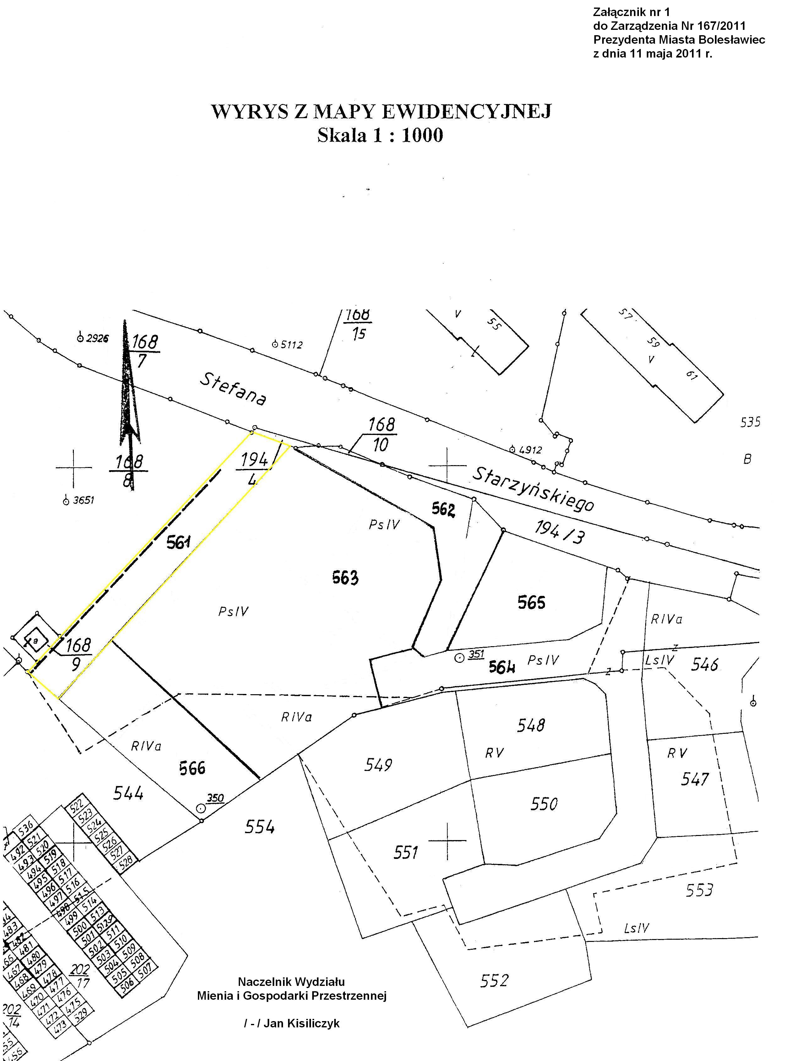 197/11  10.06.2011  zmiany zarządzenia Nr 287/09 Prezydenta Miasta Bolesławiec z dnia 21 września 2009 r. w sprawie przeznaczenia do oddania w użytkowanie wieczyste, w drodze bezprzetargowej, nieruchomości gruntowej zabudowanej położonej przy ul. Chopina w Bolesławcu, na rzecz współużytkowników wieczystych nieruchomości przyległej wraz ze sprzedażą części budynku - celem uregulowania stanu prawnego nieruchomości