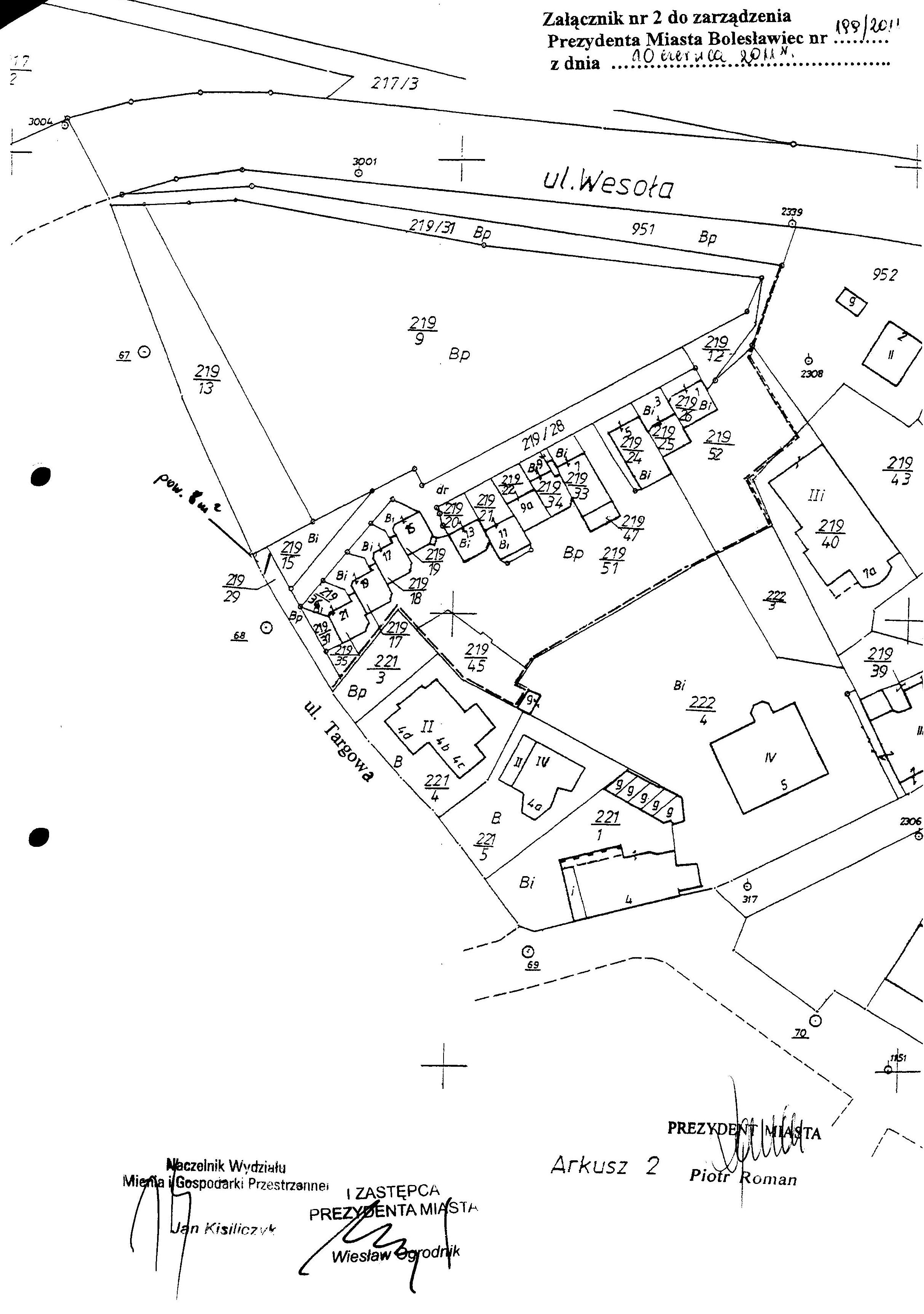 198/11  10.06.2011  zmiany zarządzenia Nr 286/09 Prezydenta Miasta Bolesławiec z dnia 21 września 2009 r. w sprawie przeznaczenia do oddania w użytkowanie wieczyste, w drodze bezprzetargowej, nieruchomości gruntowej zabudowanej położonej przy ul. Chopina w Bolesławcu, na rzecz współużytkowników wieczystych nieruchomości przyległej wraz ze sprzedażą części budynku - celem uregulowania stanu prawnego nieruchomości
